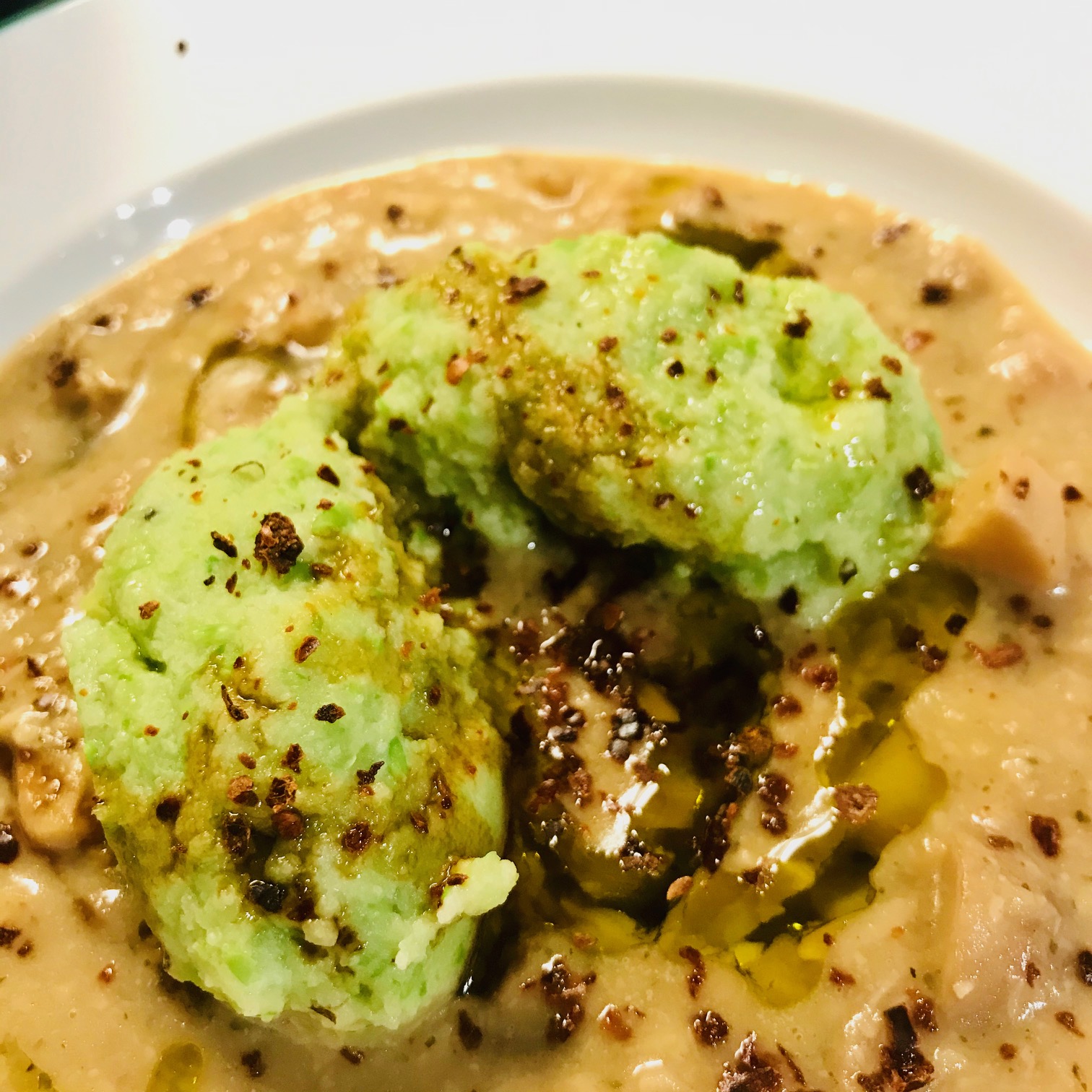Erbsen fein pürieren. Milch mit Butter aufkochen, Grieß und Erbsenpürree unterrühren, vom Herd nehmen, Ei zügig unterschlagen. Mit Salz, Macis und Pfeffer würzig abschmecken (probieren und ggf. nachwürzen) und ca. 10 Minuten ziehen lassen…