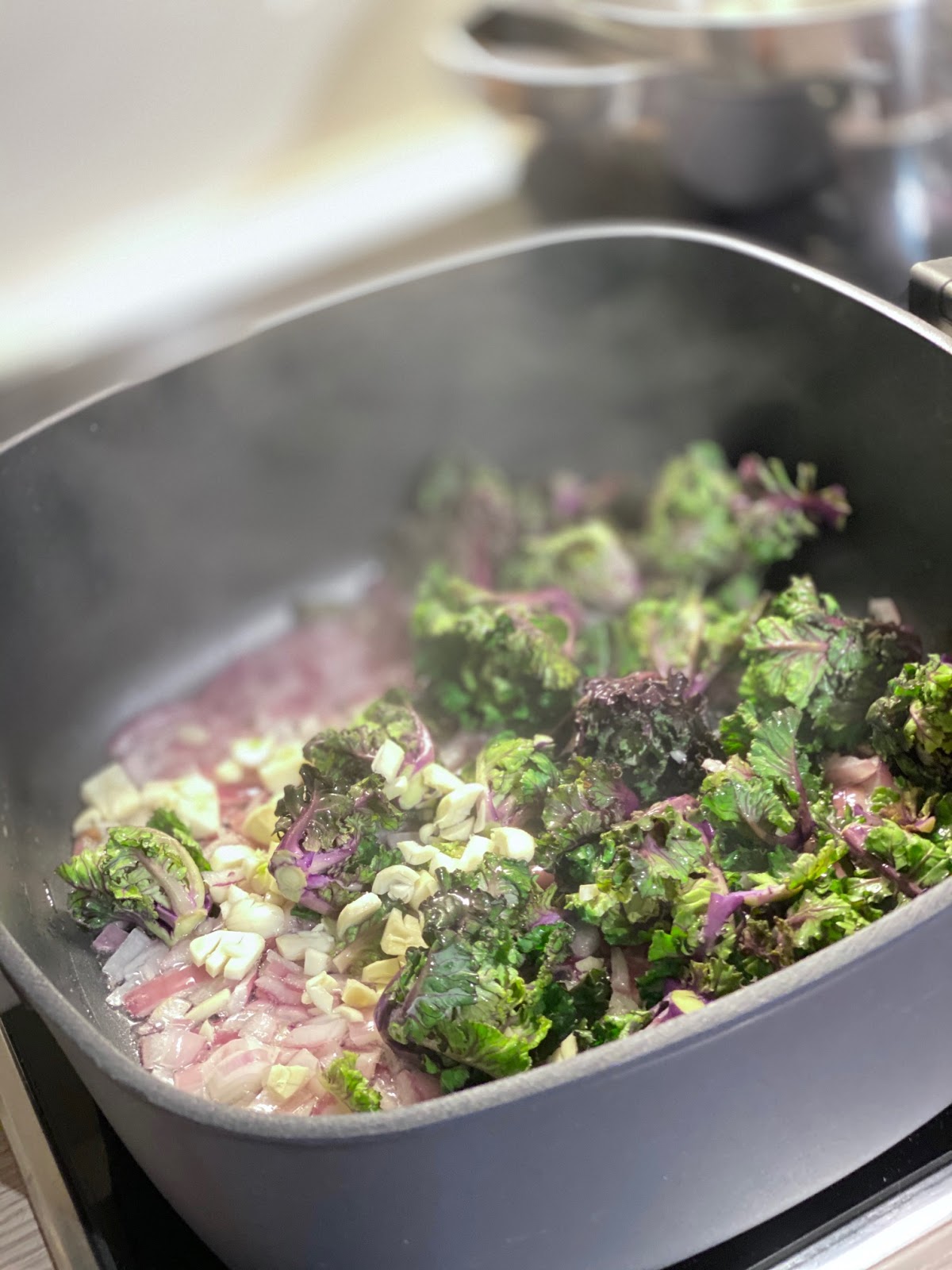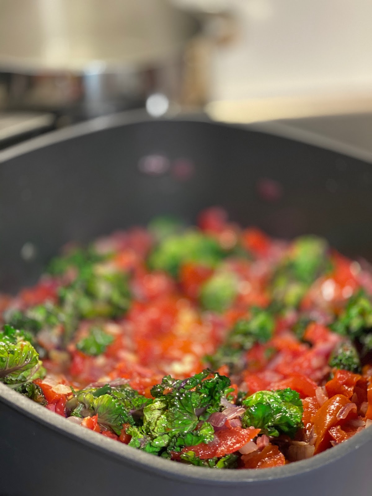 - 4-5 Minuten köcheln lassen und dann den Flower Sprout mit dazugeben. Die Hitze herunter drehen und den Flower Sprout immer wieder in der Sauce wenden bis er EIN WENIG zusammengefallen ist.