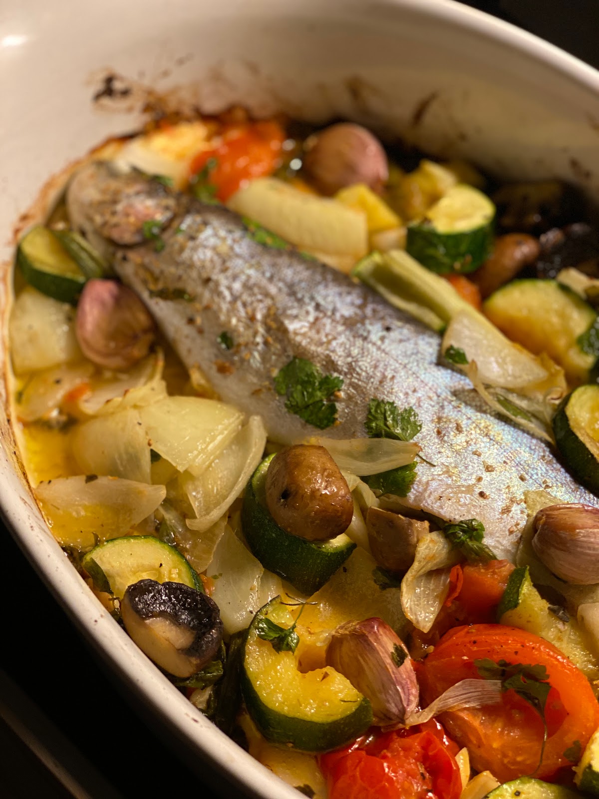 Katis Rezetgeschichten, Forelle im Gemüsebeet, Corona, Essen, Fischauflauf