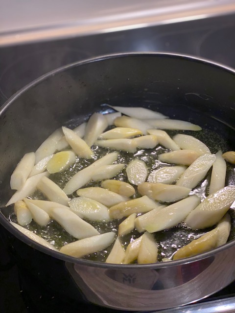 1 TL Öl in einer Pfanne auf mittlerer Stufe erhitzen, Spargelstücke darin ca. 6–8 Minuten rundherum leicht anbraten. Anschließend geviertelte Erdbeeren und 3/ 4 des Dressings mit in die Pfanne geben (die Pfanne vom Herd nehmen). Alles gut aber vorsichtig vermischen, 5 Minuten in der warmen Pfanne ziehen lassen und anschließend nochmals mit Agavendicksaft, Salz und Chili abschmecken.