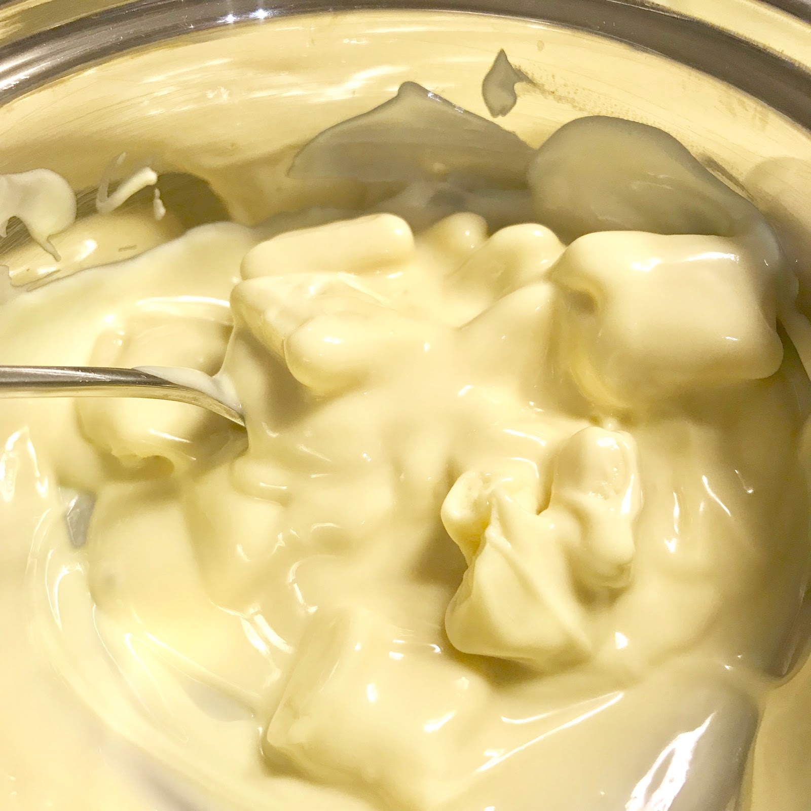 5. Als Nächstes die Schokolade schmelzen, am besten in einer hitzebeständigen Schüssel über leicht siedendem Wasser, wobei der Schüsselboden das Wasser nicht berühren darf. Die Schokolade darin 2-3 Minuten umrühren, acht geben, dass kein Wasser hinein gerät, sonst stockt sie wieder. Die flüssige Schokolade gleichmäßig unter die Frischkäsecreme ziehen.
