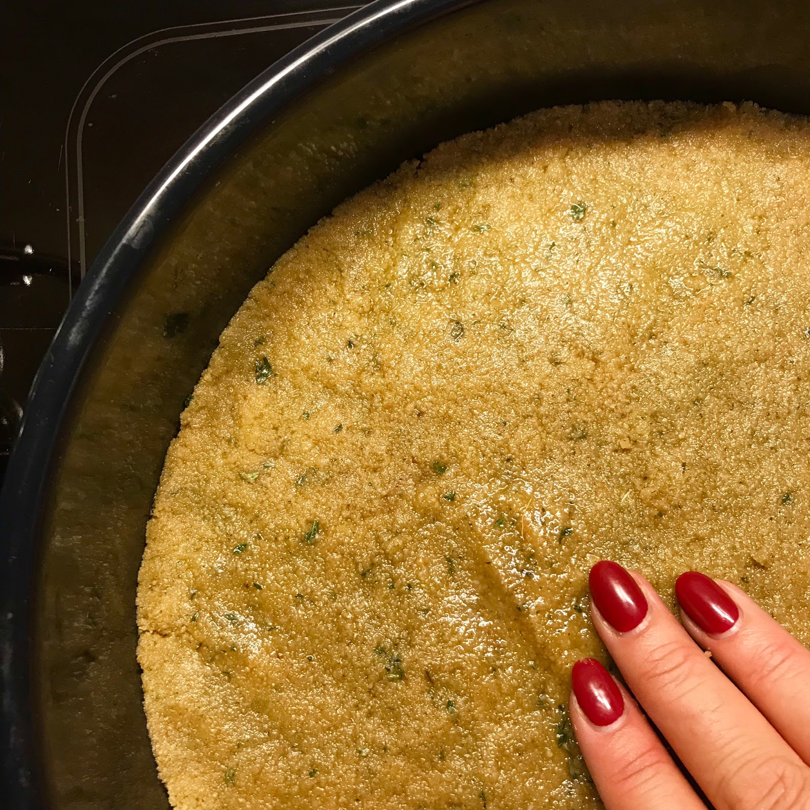 3. Die Kekse zwischen zwei Küchencrepes geben und mit der Teigrolle fein zerbröseln. Mit der Butter und 1 EL Thymian vermengen, gleichmäßig in der vorbereiteten Form verteilen und sanft andrücken. In den Kühlschrank stellen.