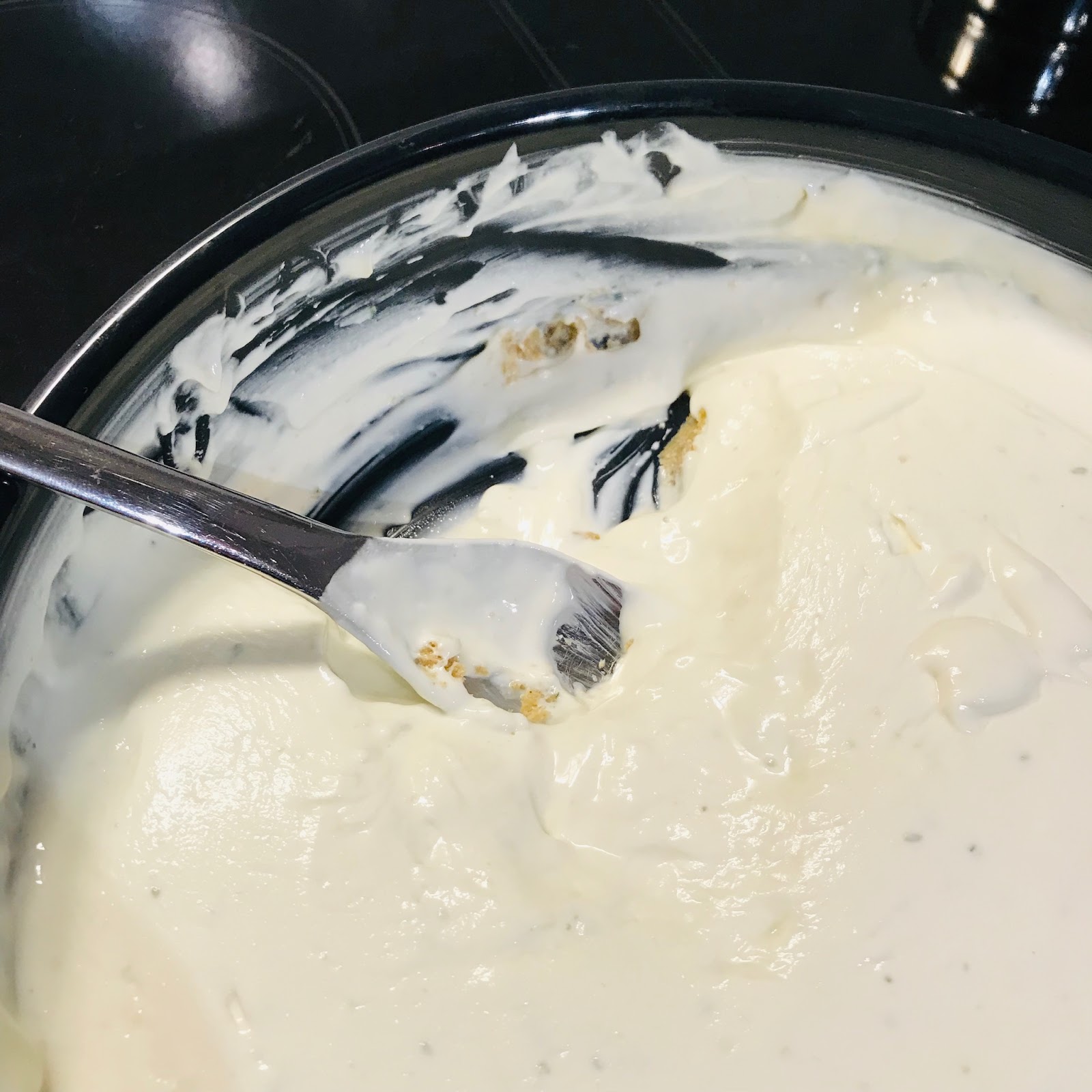 6. Die Creme auf den Keksboden in die Form gießen, glatt streichen und mindestens 2 Stunden kalt stellen, bis sie sich verfestigt hat.
