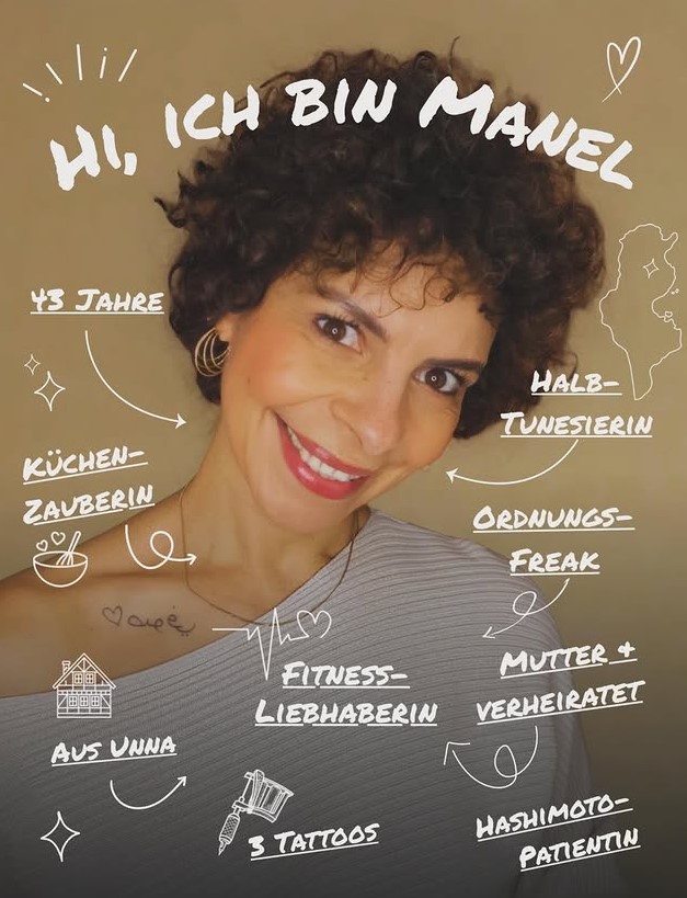 Ich bin Manel, 43 Jahre jung, komme selbst auch aus Unna und bin ein echter Familienmensch. Ich liebe Bewegung, Fitness und bin eine energievolle Alltagsjongleurin – irgendwo zwischen Familie, Terminen, Haushalt und den kleinen Momenten, die das Leben bunt machen. In einem trubeligen Alltag weiß ich nur zu gut, wie schnell man sich selbst vergisst. Genau deshalb liegt mir eine bewusste, nährstoffreiche und zugleich genussvolle Ernährung besonders am Herzen.